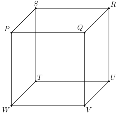 Any three vertices of the cube PQRSTUVW, shown in the figure below, can be connected to form a triangle. (For example, vertices P, Q, and R can be connected to form isosceles \triangle PQR.) How many of these triangles are equilateral and contain P as a vertex?