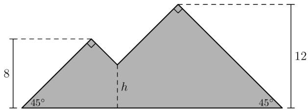 Jean has made a piece of stained glass art in the shape of two mountains, as shown in the figure below. One mountain peak is 8 feet high while the other peak is 12 feet high. Each peak forms a 90^\circ angle, and the straight sides form a 45^\circ angle with the ground. The artwork has an area of 183 square feet. The sides of the mountain meet at an intersection point near the center of the artwork, h feet above the ground. What is the value of h?