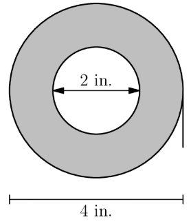 A roll of tape is 4 inches in diameter and is wrapped around a ring that is 2 inches in diameter. A cross section of the tape is shown in the figure below. The tape is 0.015 inches thick. If the tape is completely unrolled, approximately how long would it be? Round your answer to the nearest 100 inches.