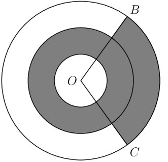 Notice that for the 3rd most outer ring of the circle, the ratio of the shaded region to non-shaded region is the ratio of \angle{BOC} to 360-\angle{BOC}. With that, all we need to do is solve for the shaded region.
