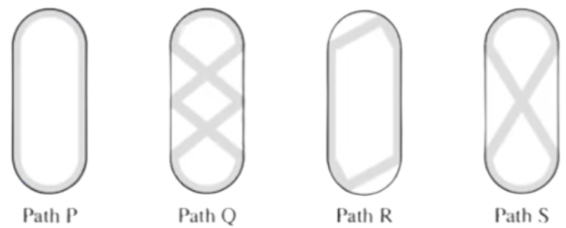 Sergai skated around an ice rink, gliding along different paths. The gray lines in the figures below show four of the paths labeled P, Q, R, and S. What is the sorted order of the four paths from shortest to longest?