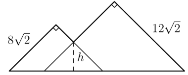 The side length of the largest right triangle is 12\sqrt{2}, which means its area is 144. Similarly, the area of the second largest right triangle is 64 (the side length is 8\sqrt{2}), and the area of the overlap is h^2 (the side length is h\sqrt{2}). Because the right triangles have a side ratio of 1:1:\sqrt{2}.Thus,