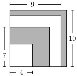 Four squares of side length 4, 7, 9, and 10 are arranged in increasing size order so that their left edges and bottom edges align. The squares alternate in color white-gray-white-gray, respectively, as shown in the figure. What is the area of the visible gray region in square units?