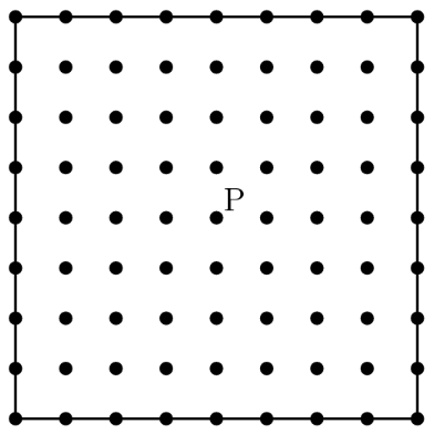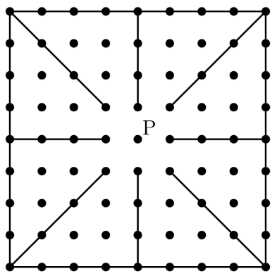 There are grid points (uniformly spaced) in the square shown in the diagram below, including the points on the edges. Point is in the center of the square. Given that point is randomly chosen among the other points, what is the probability that the line is a line of symmetry for the square?