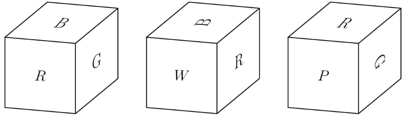 is on the top, and is on the side, and is on the right side. That means that (image ) is on the left side. From the third image, you know that must be on the bottom since is sideways. That leaves us with the back, so the back must be . The front is opposite of the back, so the answer is .