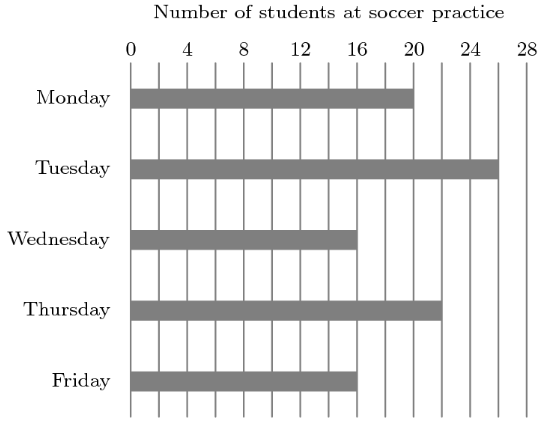 On Monday, people come. On Tuesday, people come. On Wednesday, people come. On Thursday, people come. Finally, on Friday, people come. , so the mean is . The median is . The coach figures out that actually people come on Wednesday. The new mean is , while the new median is . Also, the median increases by because now the median is instead of . The median and mean both change, so the answer is .