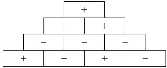 +−−+, −++−, −−−−, ++++, −+−+, +−+−, ++−−, −−++. There are 8 patterns and so the answer is .