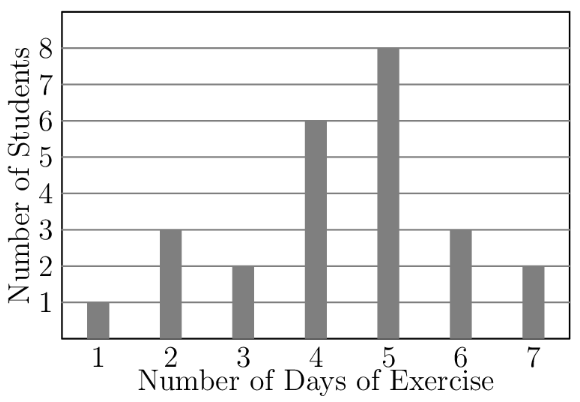 Mr. Garcia asked the members of his health class how many days last week they exercised for at least 30 minutes. The results are summarized in the following bar graph, where the heights of the bars represent the number of students.