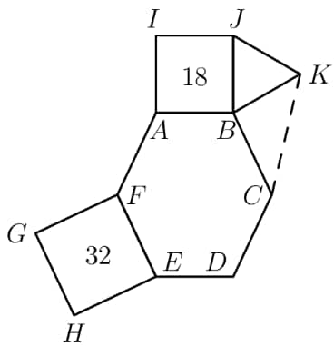 Since \overline{FE} = \sqrt{32}, and \overline{FE} = \overline{BC}, \overline{BC} = 4\sqrt{2}. Meanwhile, \overline{JB} = 3\sqrt{2}, and since \triangle JBK is equilateral, \overline{BK} = 3\sqrt{2}. If ABCDEF is equiangular, \angle ABC = \frac{180 \cdot (n-2)}{n} = 120^{\circ}, where n is the number of sides of the shape. Adding all the angles around B gives 270^{\circ}, so \angle KBC = 360 - 90 = 270^{\circ}. Because \triangle KBC is right, the area of \triangle KBC = \frac{4\sqrt{2} \cdot 3\sqrt{2}} {2} = 12. Therefore, the answer is \boxed{\textbf{(C)}~12}.