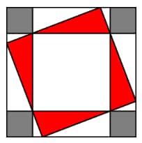 We want to find the area of the biggest square. The area of this square is composed of the center white square and the four red triangles. Because the inner square has an area of (5-2), 3, squared, 9, it also has a length of \sqrt{9}=3. The heights of each of the red triangles are 1 (because the gray squares have lengths of one), and the area of one triangle is namely \frac{3 \cdot 1}{2}. Thus, the combined area of the four triangles is 4 \cdot \frac 32=6. Furthermore, the area of the smaller square is 9. We add these to see that the area of the large square is 9+6=15\implies \boxed{\textbf{(C)}}.