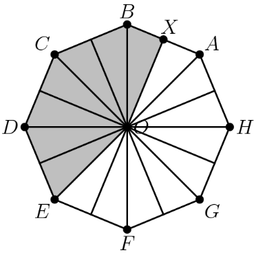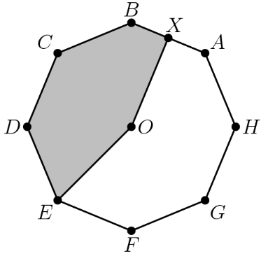 Point O is the center of the regular octagon ABCDEFGH, and X is the midpoint of the side \overline{AB}. What fraction of the area of the octagon is shaded?