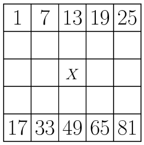 We begin filling in the table. The top row has a first term 1 and a fifth term 25, so we have the common difference is \frac{25-1}4=6. This means we can fill in the first row of the table: