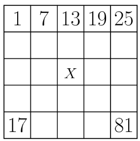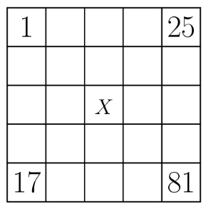 The middle term of the first row is \frac{25+1}{2}=13, since the middle number is just the average in an arithmetic sequence. Similarly, the middle of the bottom row is \frac{17+81}{2}=49. Applying this again for the middle column, the answer is \frac{49+13}{2}=\boxed{\textbf{(B)}~31}.