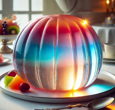By making two vertical cuts from top to bottom, the jelly is divided into 4 pieces. Then, by making a horizontal cut through the middle, the jelly can be further divided into 8 pieces.