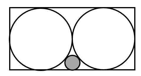 A rectangle is inscribed with two equal circles, each having an area of . A small circle is tangent to three figures (the two large circles and one side of the rectangle). What is the area of the small circle?