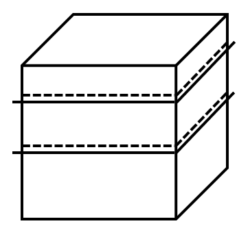 We can calculate the volume by dividing the cube into five layers from top to bottom: