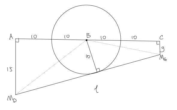 A silo (right circular cylinder) with diameter meters stands in a field. MacDonald is located meters west and meters south of the center of the silo. McGregor is located meters east and meters south of the center of the silo. The line of sight between MacDonald and McGregor is tangent to the silo. The value of g can be written as , where and are positive integers, is not divisible by the square of any prime, and is relatively prime to the greatest common divisor of and . What is ?