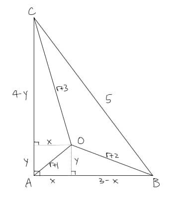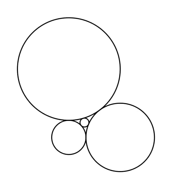 A circle of radius r is surrounded by three circles, whose radi are , , and , all externally tangent to the inner circle and externally tangent to each other, as shown in the diagram below.