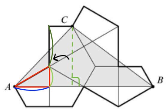 Now all we have to do is find the height. We can split the height into 2 sections, the green and the light green. The green section must be , as shows us. Also, the light green section must be equal to , as in the previous paragraph, the triangle outlined in red is . Then, the green section, which is the height, must be , which is just .