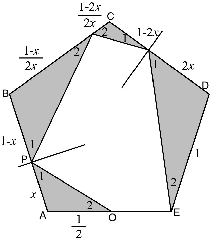 In a new billiard game, the table is a regular pentagon with side length meter. The five vertices are pockets. The ball is always struck from the midpoint of . When the ball hits the edge of the table, it rebounds. If the ball reaches a pocket, it falls in. After a shot, the ball first hits point on edge , then rebounds towards edge , rebounds again at edge , then rebounds at edge , and finally falls into pocket . What is the distance between point and point ?