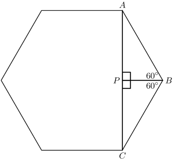 Now, we can find the height of the hexagon to obtain an equation in terms of . Consider a hexagon with side length , where point is the foot of the perpendicular dropped from , bisecting :
