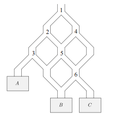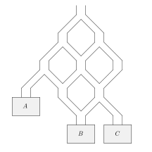 A network of pathways lead from a single opening to three bins, labelled , , as shown. If a ball is dropped into the opening, it will follow a path and land in one of the bins. Every time a path splits, it is equally likely for the ball to follow either of the downward paths. Ellen drops two balls, one after the other, into the opening. What is the probability that the two balls land in different bins?