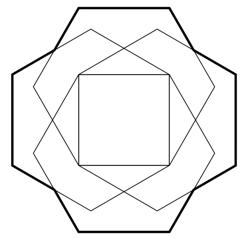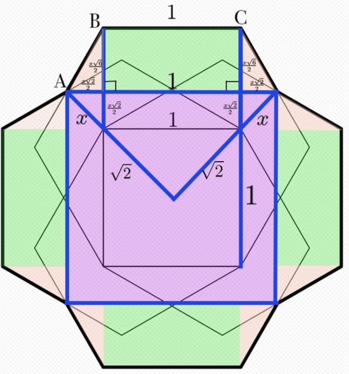 The area of the dodecagon is equal to the sum of the areas of the four rectangles, eight orange triangles, and purple square. In terms of , this is